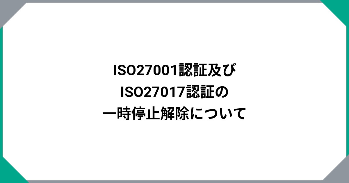 上記の事態を受け、当社が取得する情報セキュリティマネジメントシステム認証(ISO27001認証)及びクラウドセキュリティ認証(ISO27017認証)が一時停止となっておりましたが、この度、ISMS審査機関であるBSIグループジャパン株式会社の特別審査が行われ、これら認証の一時停止が解除されましたことをご報告いたします。